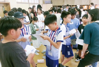 グループ交流では、両校の児童がタブレットや地図を使って互いの町について紹介。児童らは翻訳機能や身振り手振りを交えながら交流を図っていた。津田校長は「直接会っての交流はめったにない機会。子どもたちは貴重な体験になったと思う」と話した。
