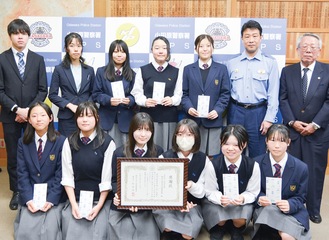 小田原警察署(松本光好署長)が5月29日、春の全国交通安全運動で書道パフォーマンスを行った相洋高校書道部に感謝状を贈呈した=写真。