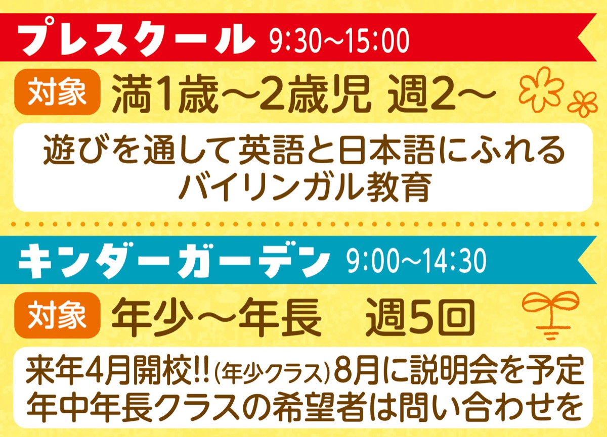 来年4月には、キンダーガーデンコース(年少クラス)が開校。英語を使いながら、アートや音楽、プログラミングなど多彩な体験を通して、創造力や思考力などを育むカリキュラムだ。8月には説明会を予定している。(年中年長クラスの希望者は問い合わせを)
