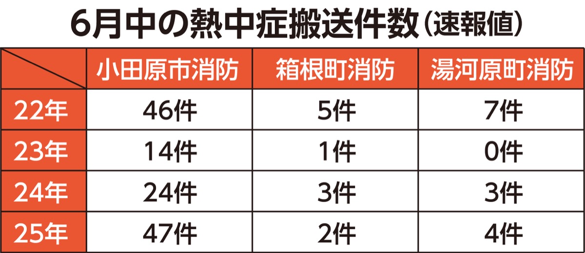 箱根町消防の管轄では過去4年間で熱中症による重症者は発生していないというが「年間の発生件数は増加傾向にある」と話す。湯河原町消防も「例年と比較して6月中の平均気温が2度上昇しており、昨年と比較して件数の増加がみられる」と警戒する。