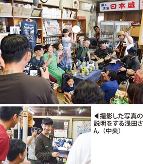 6月18日の夜には酒屋草柳商店で撮影が行われた。浅田さんは「店のワイワイとした雰囲気を出したい」と、集まった常連らと会話をしながら構図を考え、ポーズや表情などを指導していた。