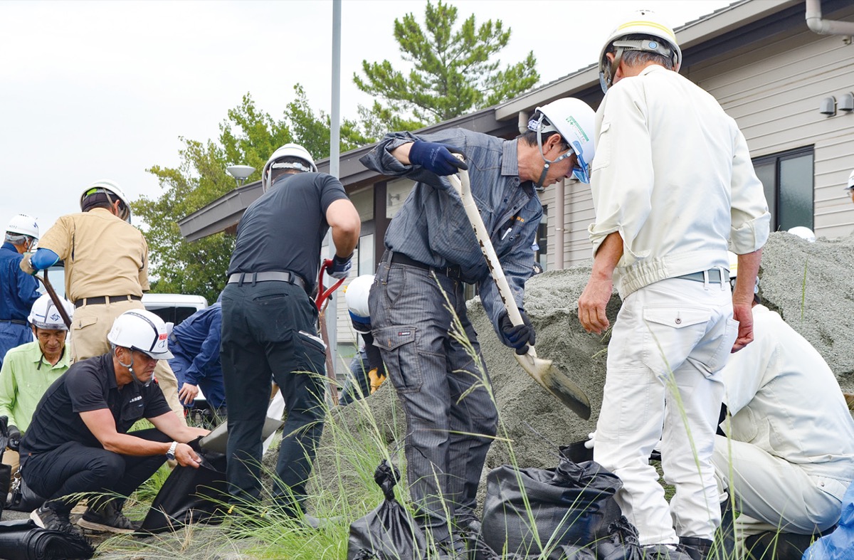 訓練は台風などの大雨で河川の氾濫が見込まれる状況を想定。市の一報を受け、同組合に設置された災害対策本部が組合員に情報を伝達した。防災ステーションに集まった組合員らはスコップで砂を袋に詰め、400袋の土のうを作製した=写真。