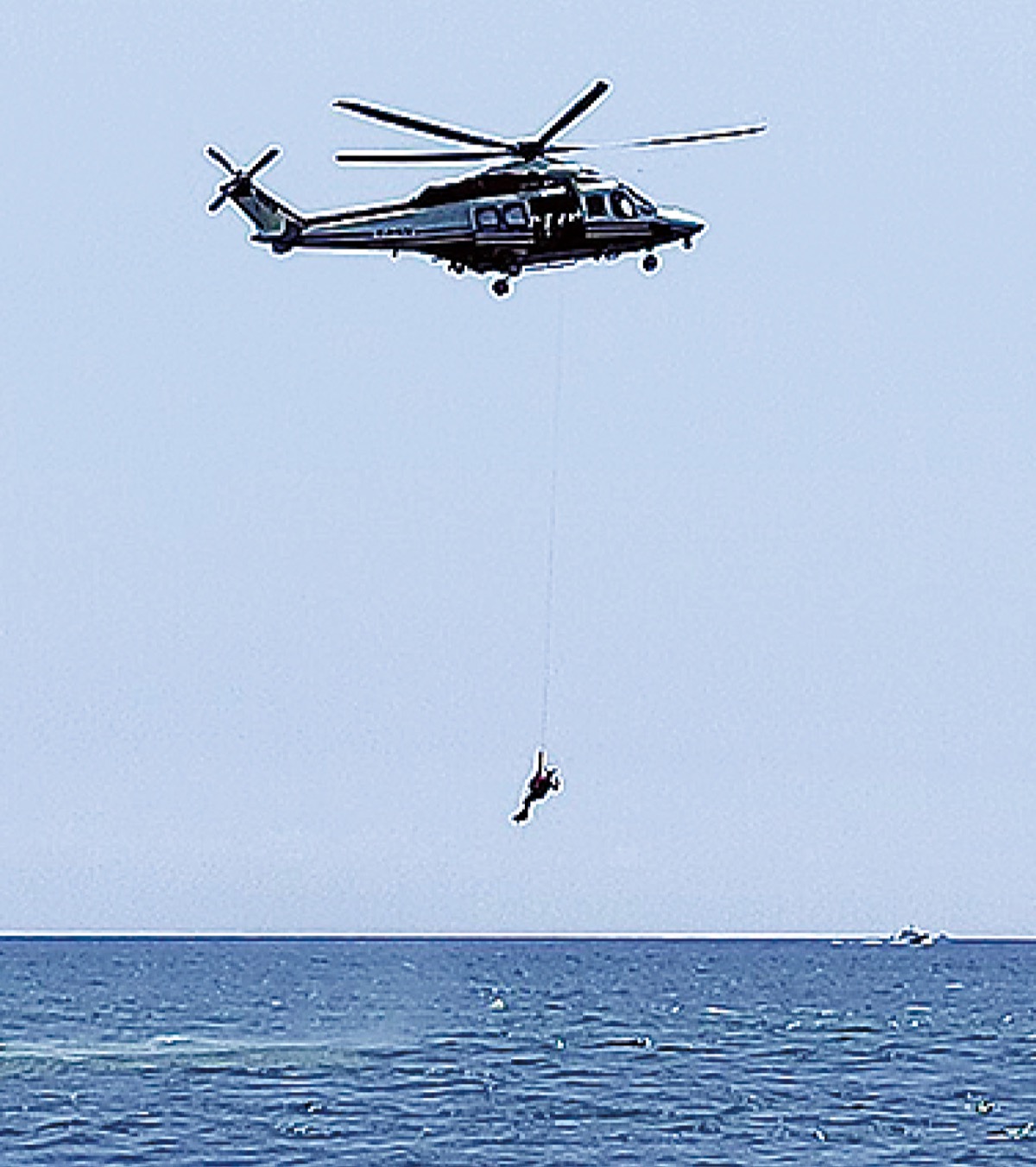 海水浴シーズンを前に7月3日、小田原市消防本部と横浜市消防局消防航空隊が酒匂海岸と沖合で初の合同海難救助訓練を実施した=写真。