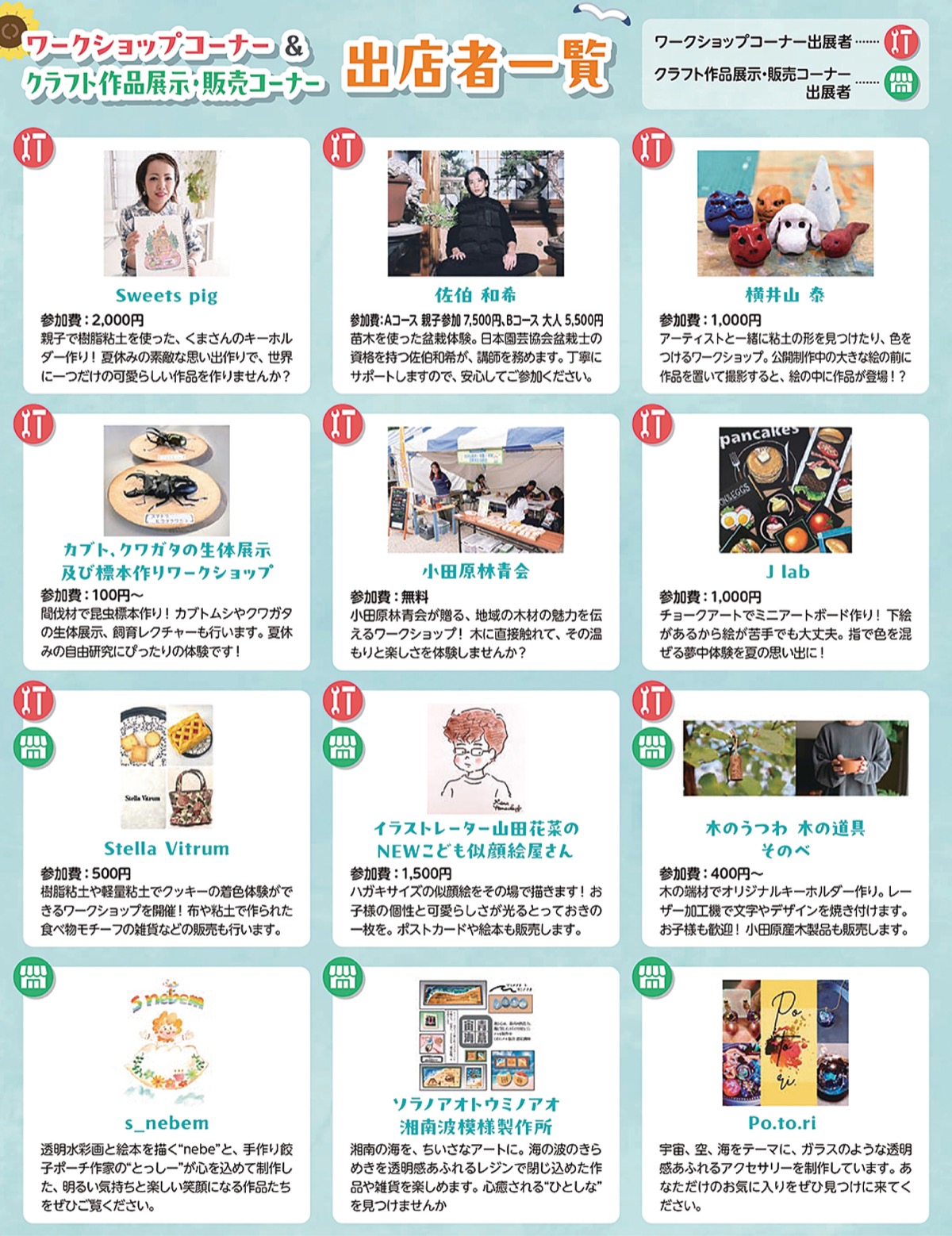 多彩な出展者を紹介。イラストレーター山田花菜のNEWこども似顔絵屋さん(ハガキサイズの似顔絵をその場で描いてくれます/参加費1500円)、木のうつわ 木の道具 そのべ(木の端材でオリジナルキーホルダー作り/参加費400円〜)、カブト・クワガタの生体展示及び標本作りワークショップ(参加費100円〜)、佐伯和希(苗木を使った盆栽体験/親子参加7500円、大人5500円)、J lab(チョークアートでミニアートボード作り/参加費1000円)、Sweets pig(親子で樹脂粘土を使ったくまさんのキーホルダー作り/参加費2000円)、Stella Vitrum(樹脂粘土や軽量粘土でクッキーの着色体験/参加費500円)、s_nebem(nebeととっしーが、心を込めて制作した作品が楽しめる)、ソラノアオトウミノアオ・湘南波模様製作所(湘南の海を小さなアートに。心癒される作品を見つけて)、Po.to.ri(宇宙、空、海をテーマにしたアクセサリー。お気に入りを探そう)、横井山 泰(アーティストとともに粘土の形を見つけたり、色付けを/参加費1000円)、小田原林青会(地域の木材の魅力を伝えます/参加費無料)