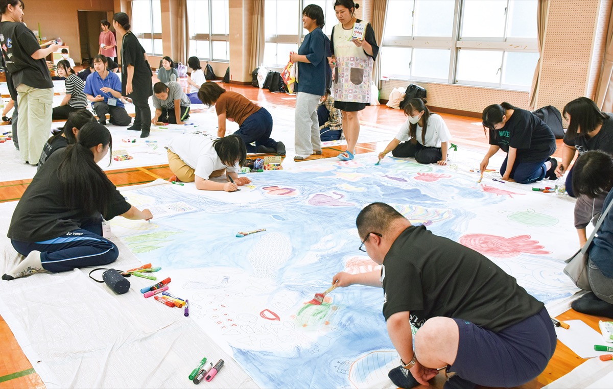 同法人の施設で創作活動を行う30人のアーティストと、保育士や幼稚園教諭などを目指す保育学科の1・2年生90人が参加。10チームに分かれ、3m四方の画用紙に「海の世界」をイメージした魚やタコ、人魚などの絵を描いていった。