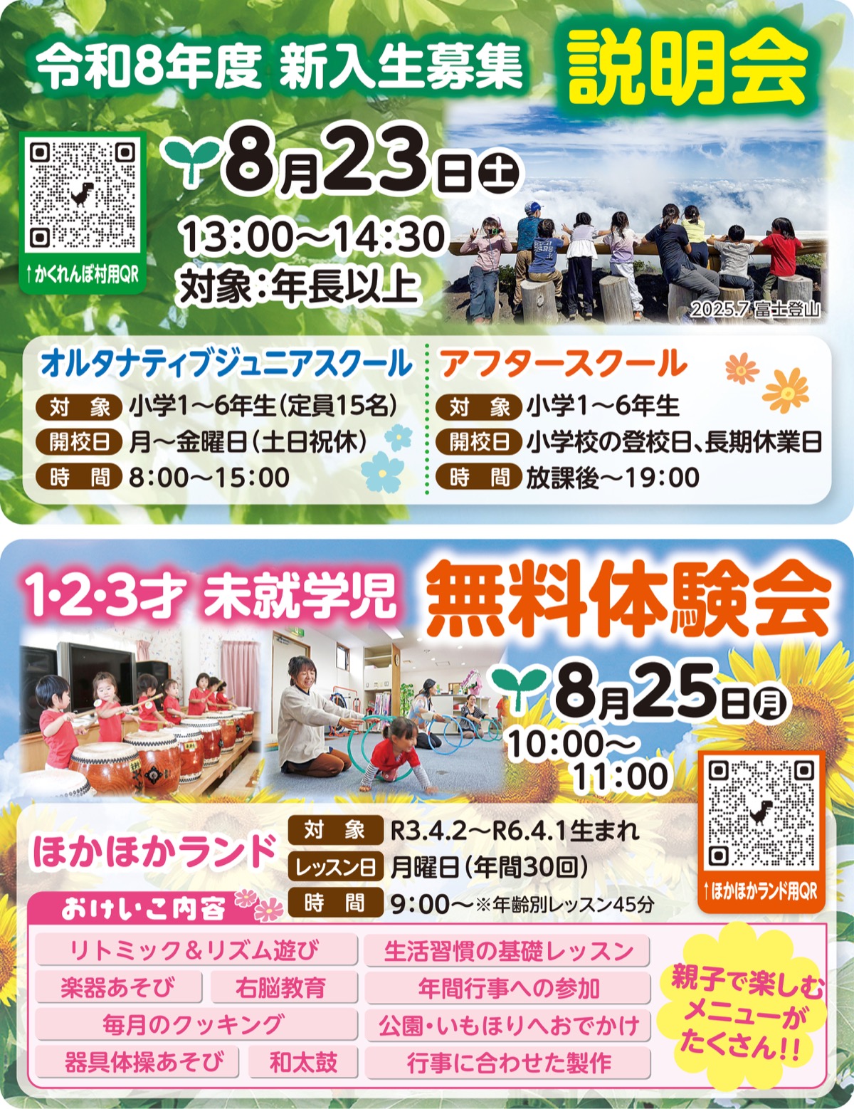 また8月25日(月)午前10時から11時、同施設で開催中の1・2・3歳児クラス「ほかほかランド」の無料体験会も実施。こちらは月曜日に行われている人気の幼児教室(年間30回)で、多彩な「体験レッスン」を楽しみながら心と体を育む豊かな時間を提供している。こちらは子どもを連れて気軽に参加を。