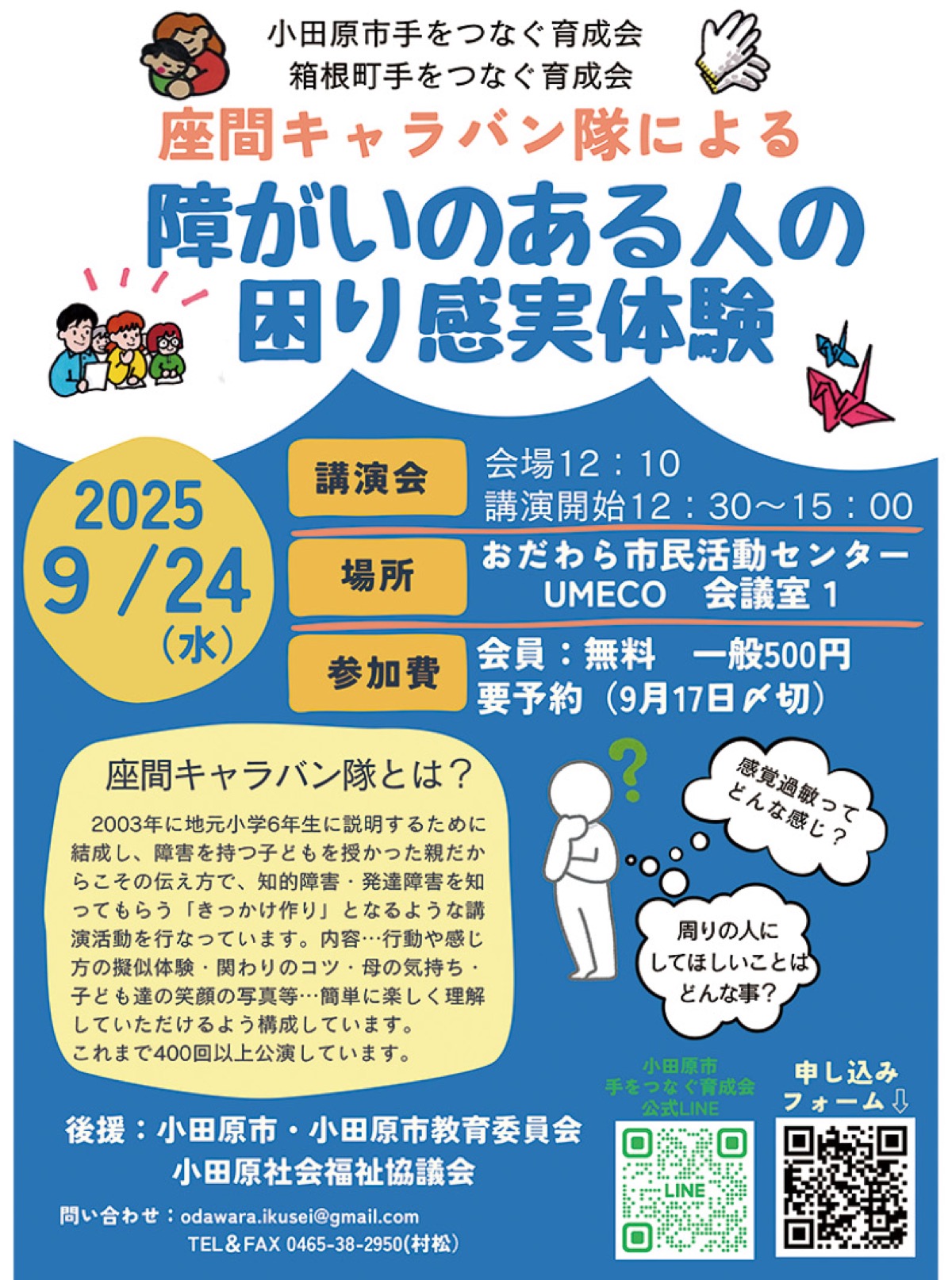 小田原市手をつなぐ育成会と箱根町手をつなぐ育成会が9月24日(水)、講演会「障がいのある人の困り感実体験」を開催。