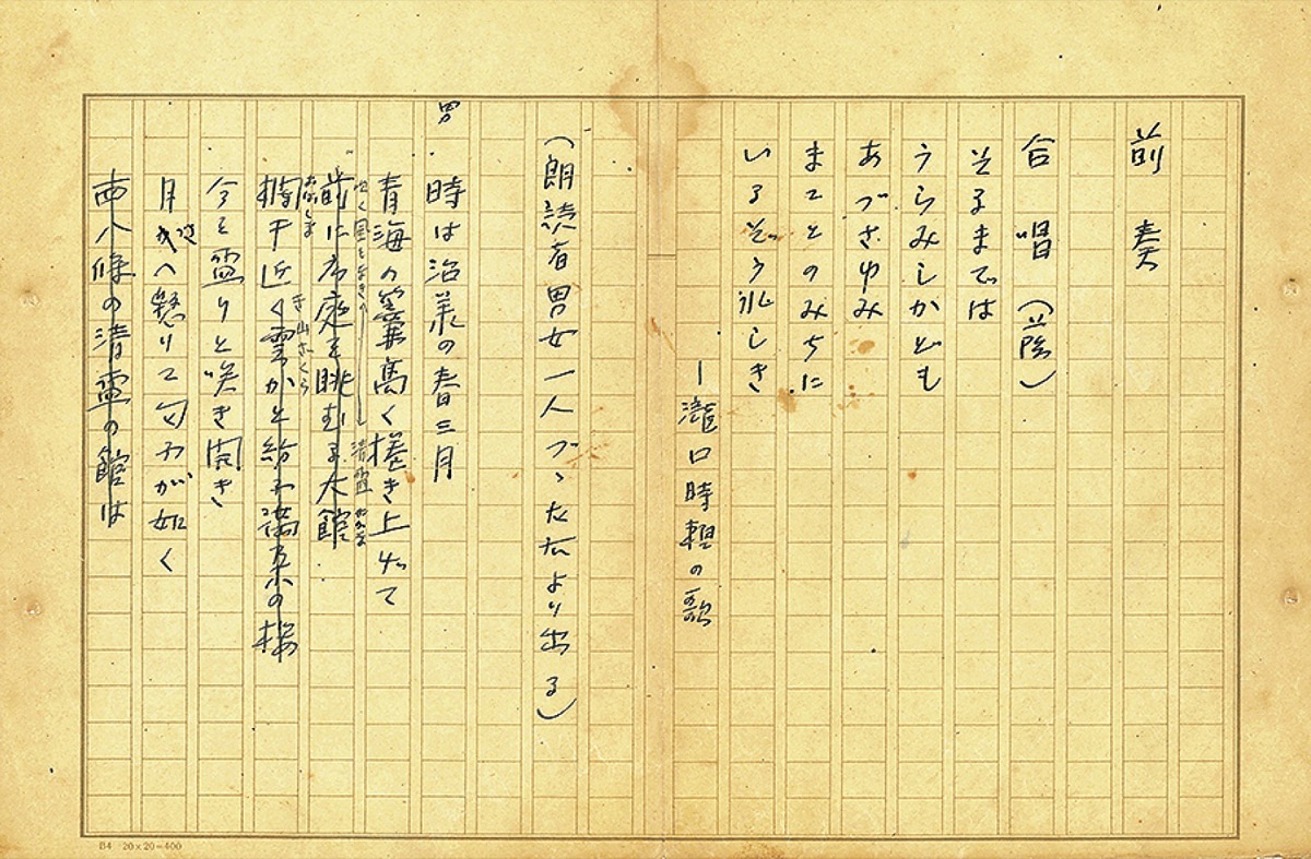 北條が第1回公演のために高山樗牛(1871年〜1902年)の同名小説を朗読用にアレンジした劇詩『瀧口入道』の自筆シナリオ原稿が初公開されるほか、公演ポスター、パンフレット、北條とこゆるぎ座との交流がうかがえる資料などが並ぶ。