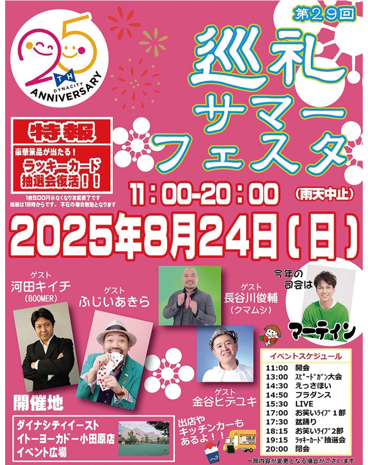 人気のお笑いライブは今年もマーティンさんが司会を務め、長谷川俊輔さん(クマムシ)、金谷ヒデユキさん、ふじいあきらさん、河田キイチさん(BOOMER)が登場。また今年はダイナシティ25周年を記念し、豪華景品が当たるラッキーカード抽選会(1枚500円、なくなり次第終了)も復活する(抽選会は午後7時15分開催)。