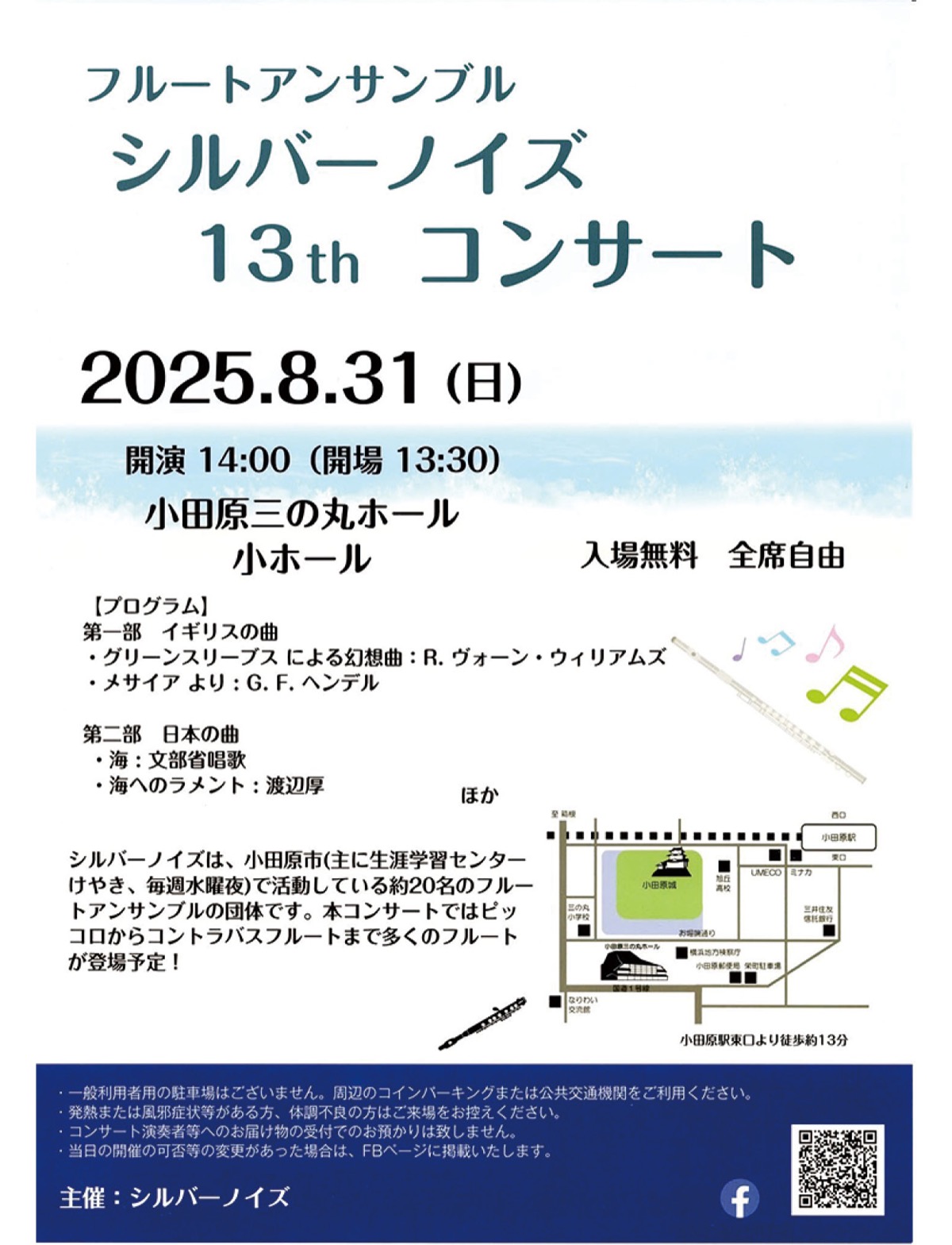 小田原市で50年以上活動しているフルートアンサンブル団体「シルバーノイズ」が13回目のコンサートを8月31日(日)、小田原三の丸ホールで行う。午後2時から4時まで(1時30分開場)、入場無料。