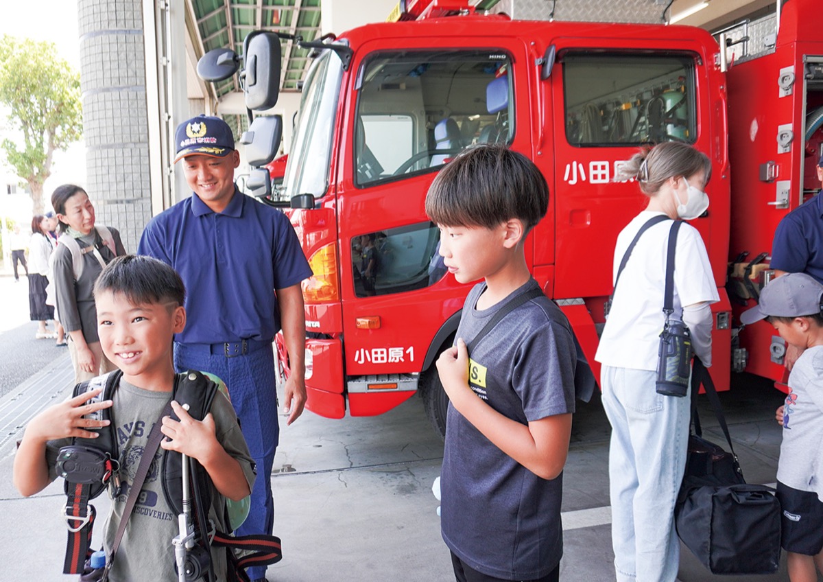 6日は小田原市消防本部で、庁舎内にある消防指令センターや消防車両などの見学が行われた。参加者は動画で消防の仕事について学び、消防職員の案内で見学を開始。車両に搭載された資機材の紹介や役割についての説明を受け、火災現場などで隊員が使用する空気呼吸器を背負った男児は「思っていたより重い」と驚いていた。