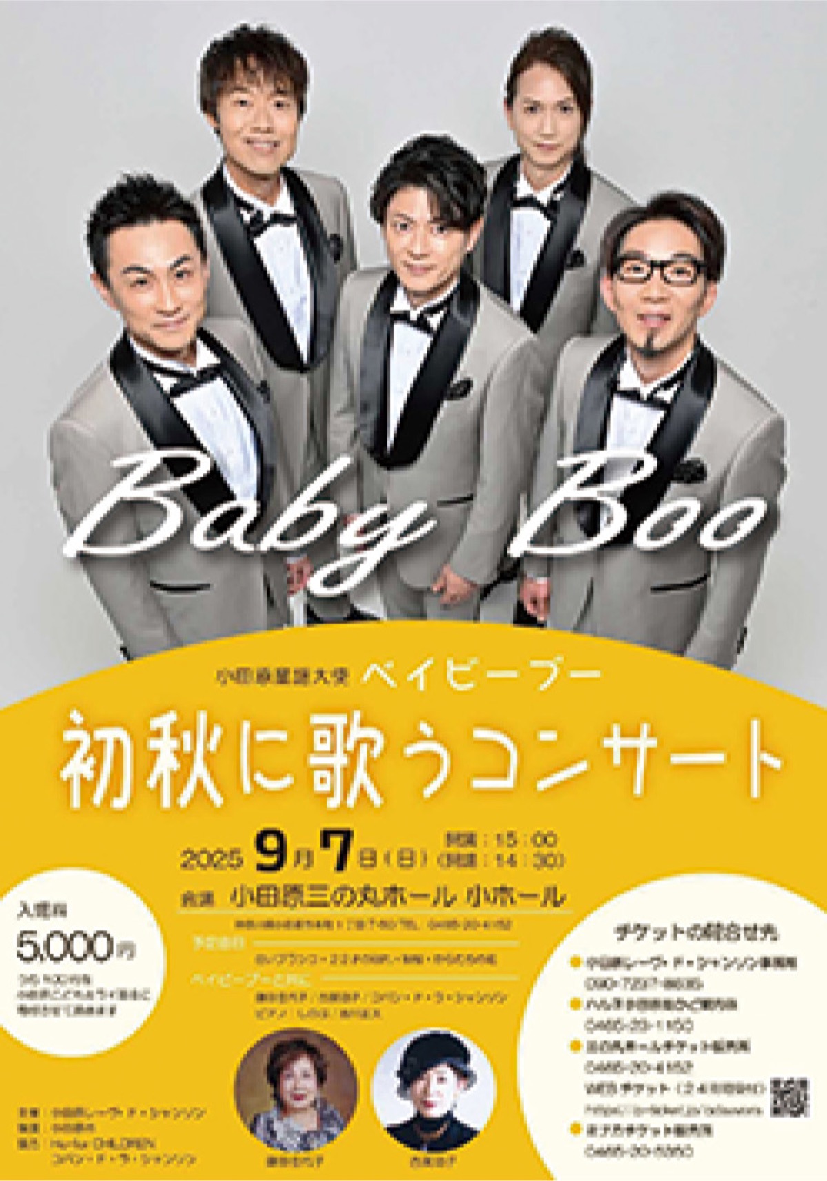 男性5人組コーラスグループ「ベイビーブー」が9月7日(日)、小田原三の丸ホールで「初秋に歌うコンサート」を開催する。午後2時30分開場、3時開演。