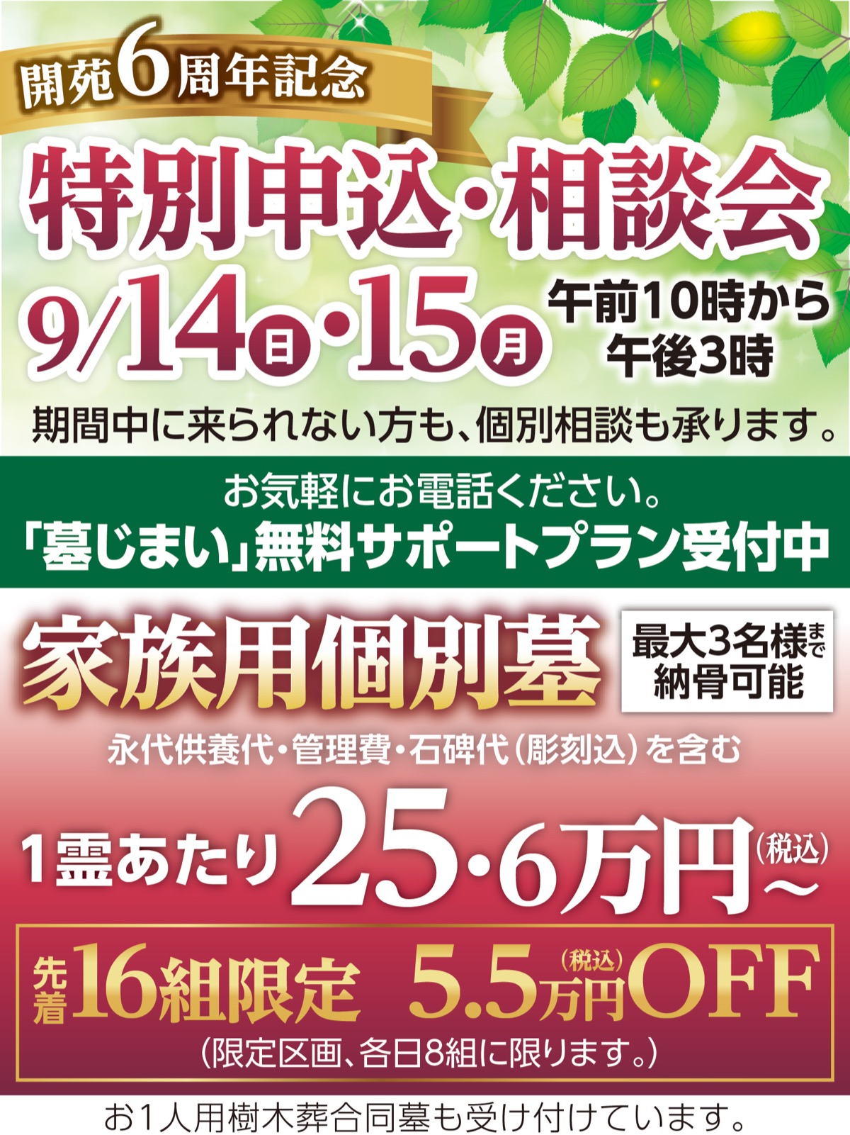 期間中は、3名まで納骨可能な家族用個別墓(1霊あたり25万6千円〜)を各日先着8組限定に特別価格で販売する。