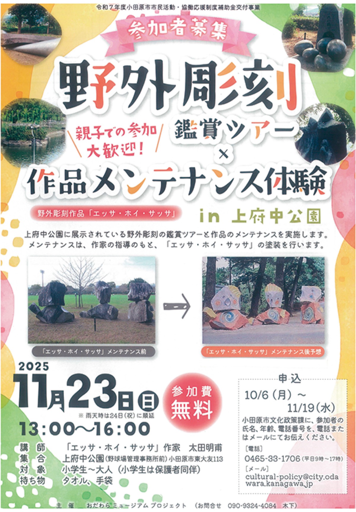 当日はガイドの説明を聞きながら野外彫刻の鑑賞ツアーを行った後、「エッサ・ホイ・サッサ」の作者太田明甫さんの指導のもと再塗装し、同作品を色鮮やかによみがえらせる。