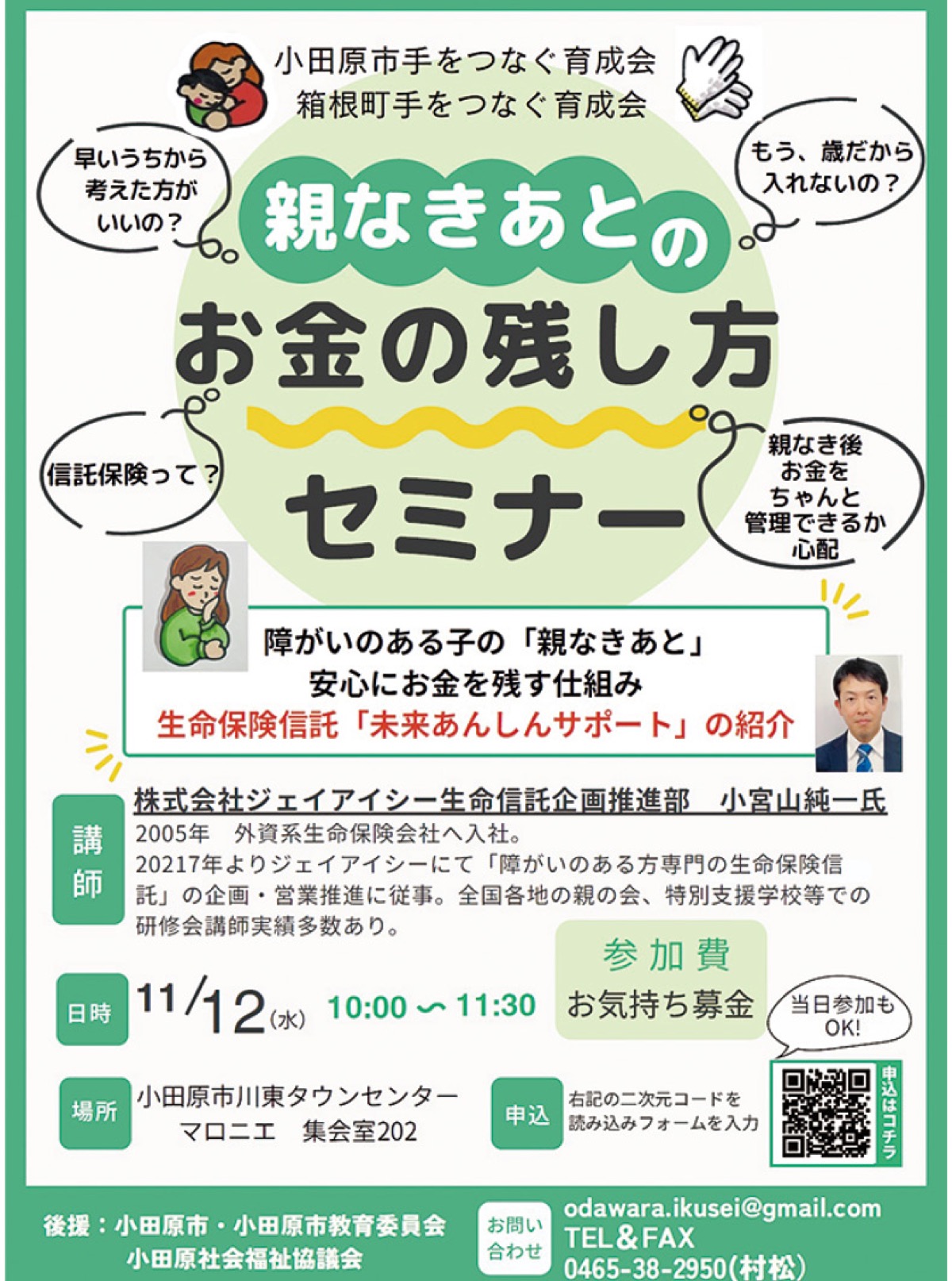 小田原市手をつなぐ育成会と箱根町手をつなぐ育成会が11月12日(水)、「親なきあとのお金の残し方セミナー」を開催する(後援/小田原市ほか)。小田原市川東タウンセンターマロニエ集会室202で午前10時〜11時30分。参加費は「お気持ち募金」。