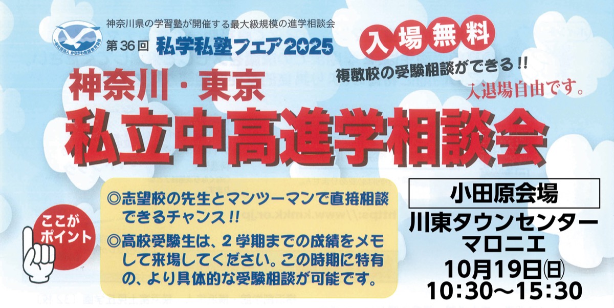 川東タウンセンターマロニエ(小田原市中里)で10月19日(日)、県内学習塾が主催する「神奈川・東京 私立中高進学相談会」が開催される。午前10時半〜午後3時半、入場無料(予約不要)。