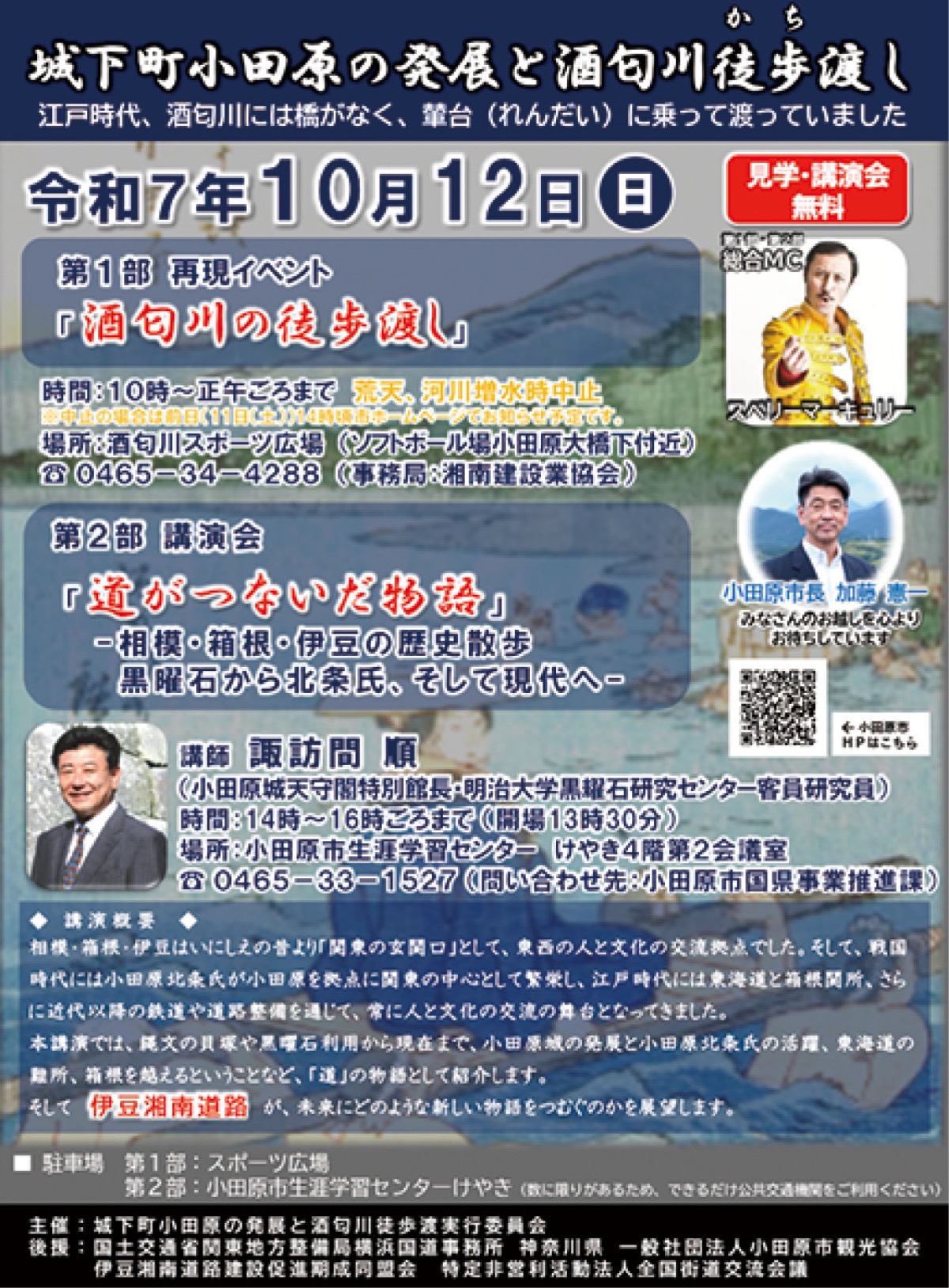 主催は城下町小田原の発展と酒匂川徒歩渡し実行委員会。第1部は再現イベント「酒匂川の徒歩渡し」を実施。酒匂川スポーツ広場(ソフトボール場・小田原大橋下付近)で午前10時〜正午ごろまで。荒天・河川増水時は中止、事前申し込み不要。(問)事務局(湘南建設業協会)【電話】0465・34・4288