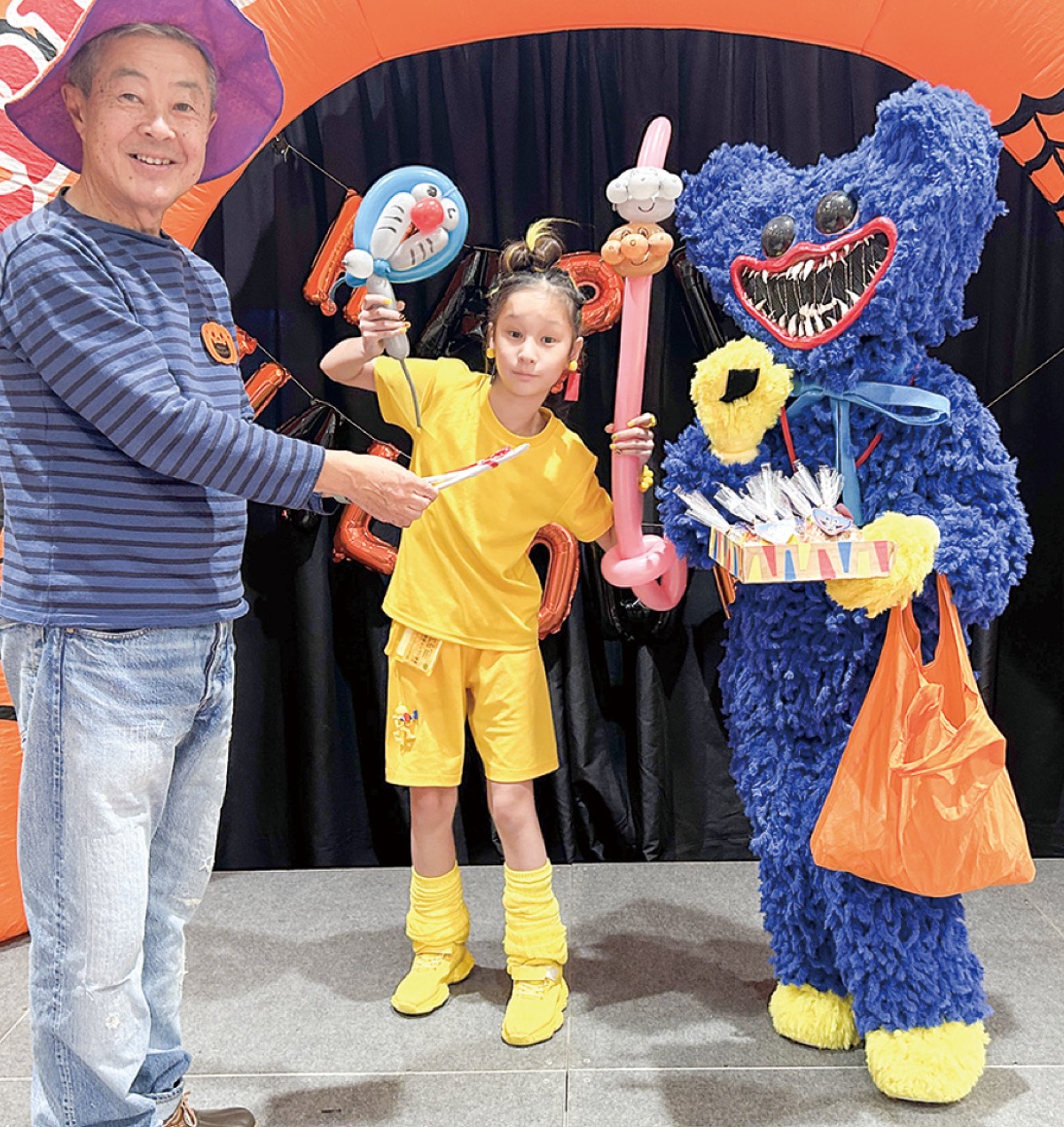 うめまる広場で行われた「仮装コンテスト」には12組が参加。妖怪や妖精、大阪・関西万博のミャクミャクなど趣向を凝らした仮装でレッドカーペットを歩き会場を盛り上げた。グランプリには、毛糸を一本一本縫い付けるなどしてゲーム「ポピープレイタイム」のキャラクターを再現した藤井みゆきさん(南足柄市)親子が選ばれた。