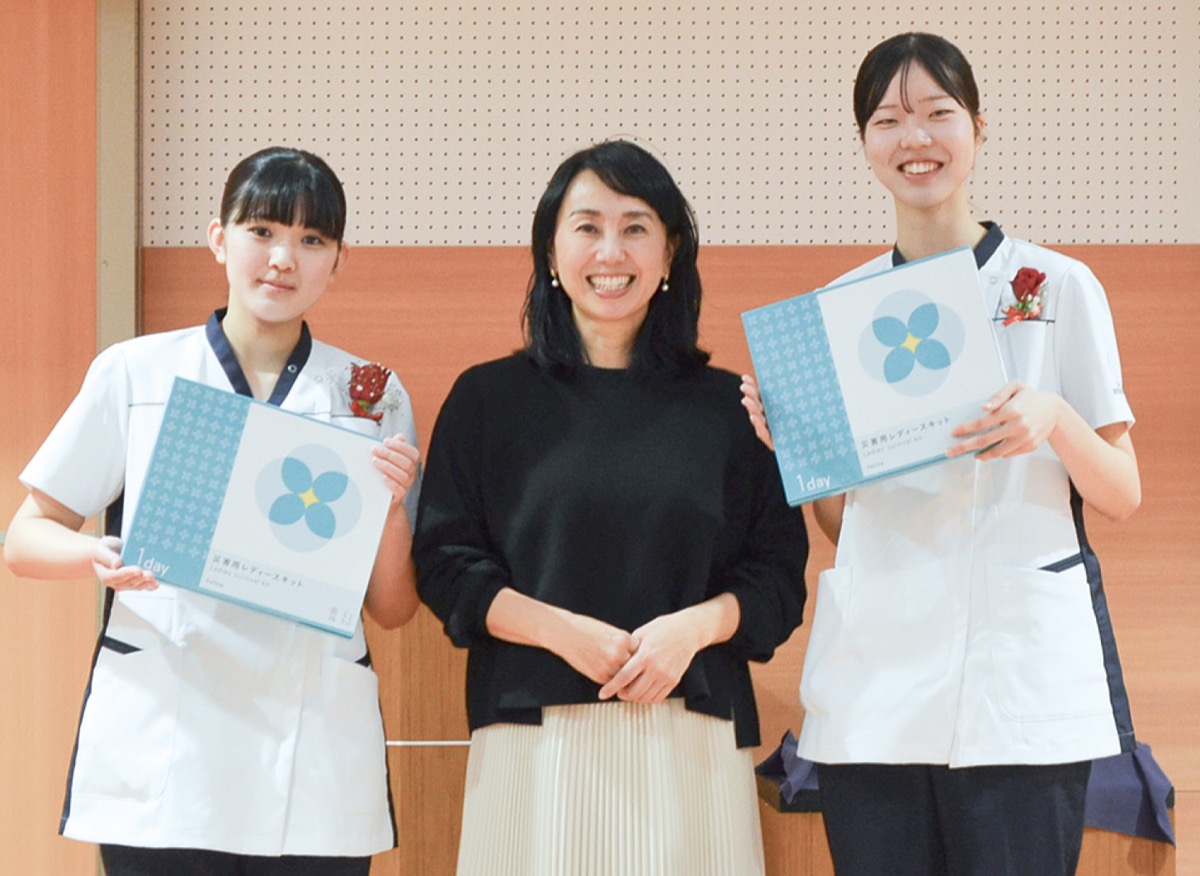 式典の後には、NPO法人TGP(東尾理子代表)から災害用レディースキットの贈呈式が行われた。東尾代表は学生に寄贈品を手渡し、「皆さんが夢や目標をかなえて、みんなを笑顔にできるように」と、看護師を目指す学生たちに温かいエールを送った。