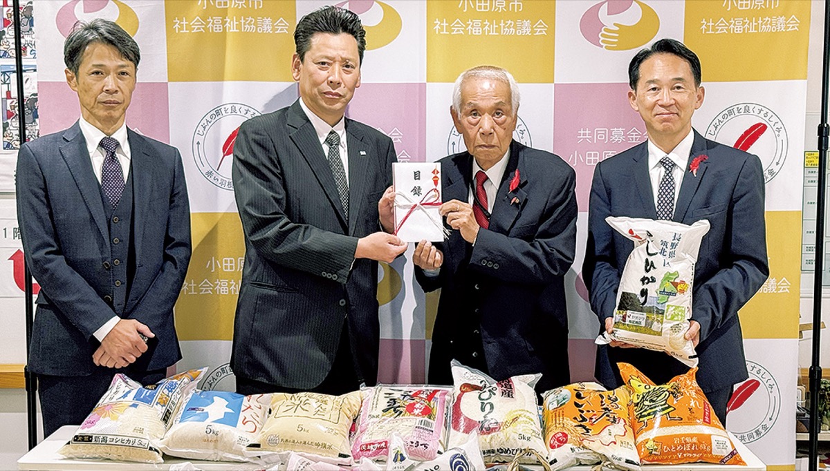 11月25日に小田原市社会福祉協議会を訪れ、木村秀昭会長に米136kgと6万2000円を手渡した。