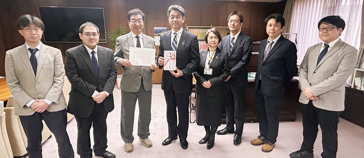 田中保行代表取締役社長ら関係者6人が11月18日に小田原市役所を訪れ、奨学基金積立金として5万円を寄付した。
