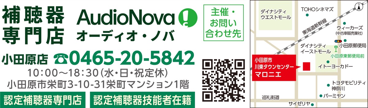 10月に好評を博した 『補聴器専門店オーディオ・ノバ 小田原店』主催の「聞こえと補聴器の相談会」が再び開催。12月21日(日)、小田原市川東タウンセンター マロニエ集会室204(小田原市中里/鴨宮駅から徒歩15分)で行われる。
