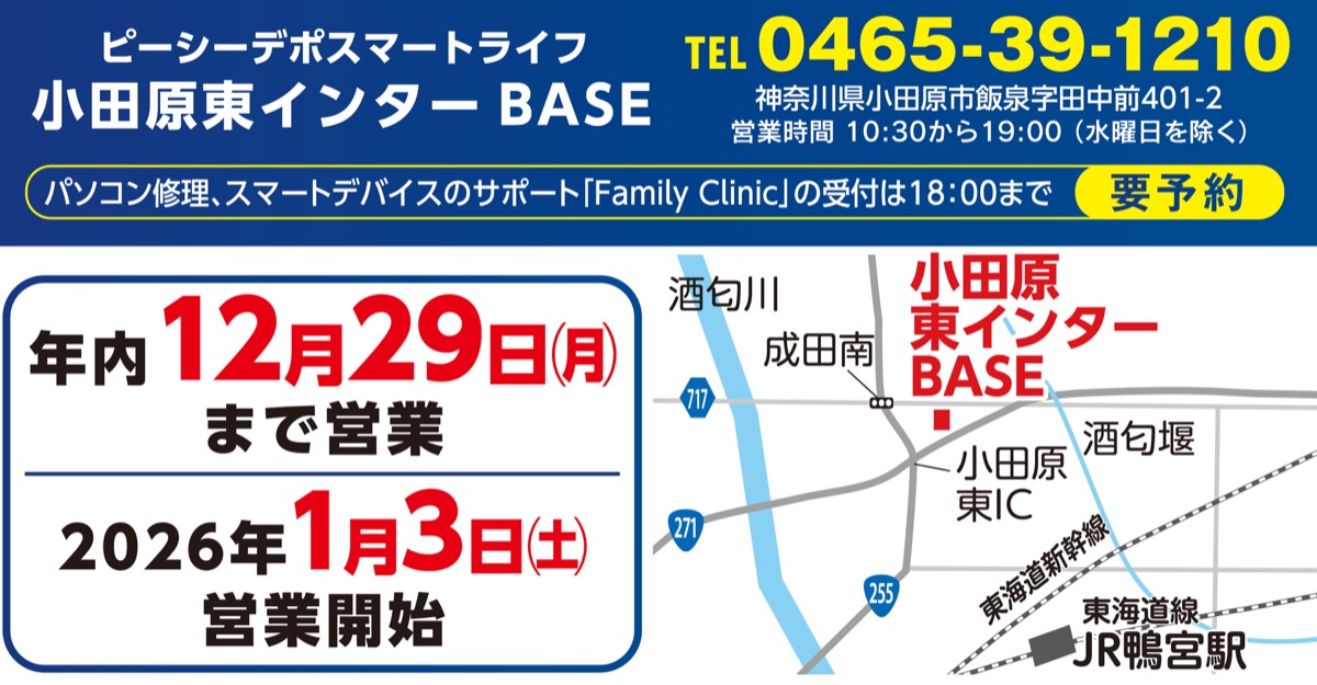 スマートライフ小田原東インターBASEでは現在、ウィンドウズ11への移行などの相談を受けつけている。「そのままにしておくのは、家の鍵とドアを開けっぱなしにしておくようなもの」と同店。「古いパソコンをお持ちの方はぜひ一度ご相談ください」と呼び掛けている。