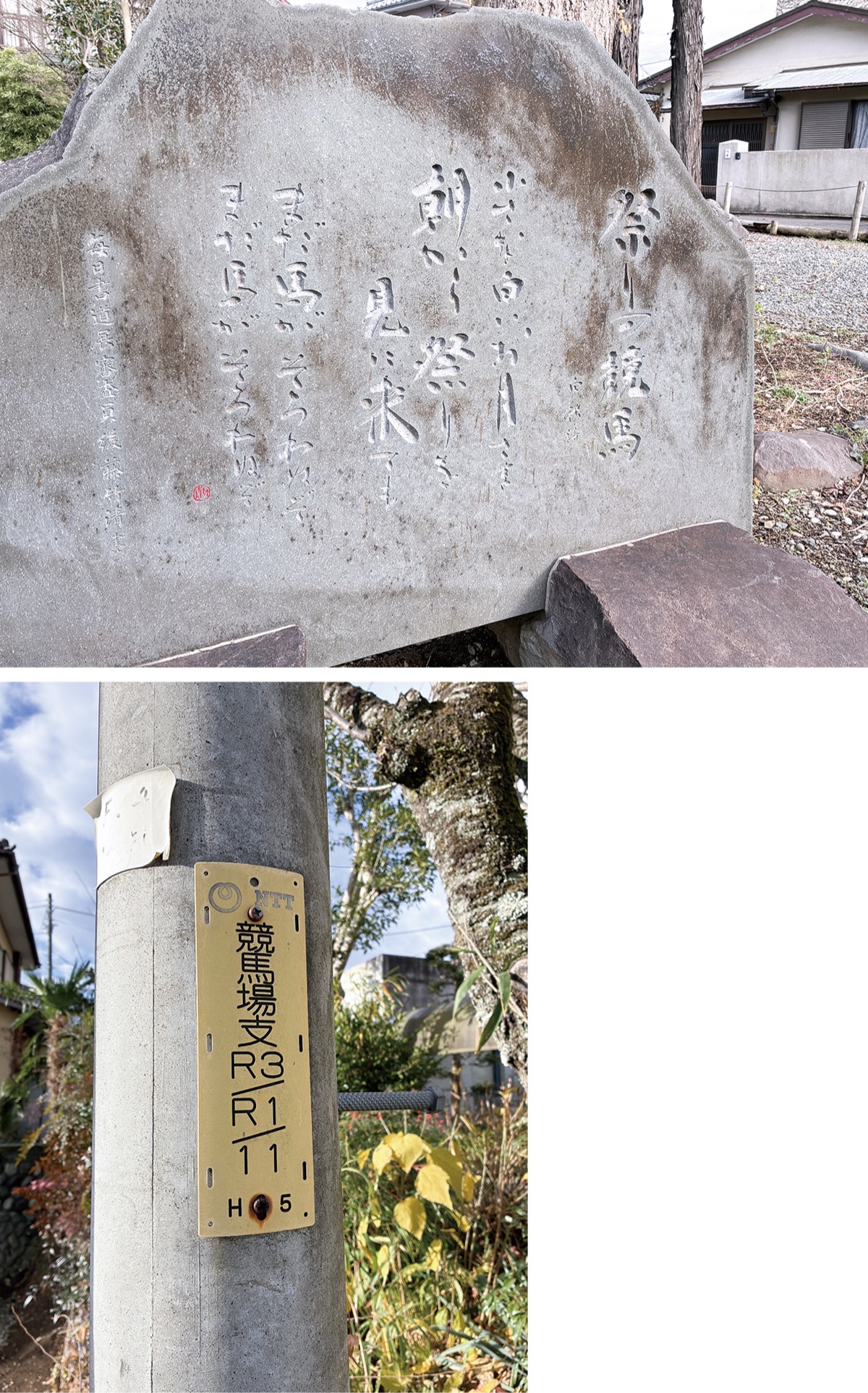 寺の周辺にある電柱には「競馬場」と書かれたNTT東日本の番号札が掲げられ、一帯がかつて競馬場であったことを偲ばせる。