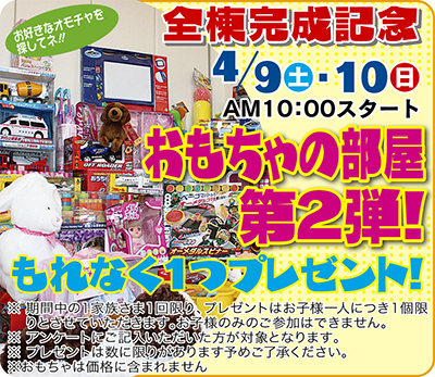 また、全棟完成を記念して「おもちゃの部屋」第2弾も同時開催。モデルハウス(5号棟)の1部屋が子どもに人気のおもちゃがいっぱいのおもちゃ部屋に大変身する。ご来場のお子様にはお好きなおもちゃがプレゼントされるので、ぜひご家族で気軽に来場を。