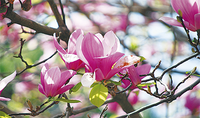 モクレンは中国南西部が原産地の落葉低木で小型のものは樹高が3〜5mになる。花は濃い紅色から薄紫色で、強く上品な芳香が特徴。花期は4月から5月。紫色の花が咲くことから「紫木蓮(シモクレン)」という別名もある。