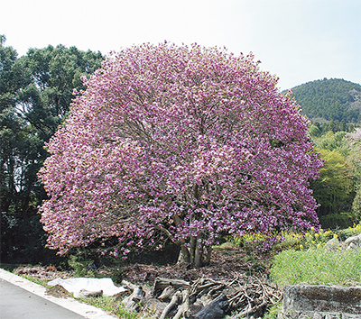 南足柄市矢倉沢の公民館脇から金太郎自然園に向かって徒歩5分、北沢川のほとりにある樹齢約30年のモクレンの木に薄紫色の見事な花が咲き、見頃を迎えている。