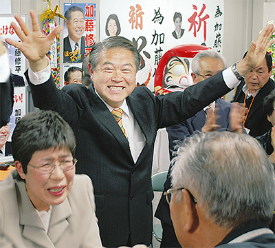 午後10時30分頃、支持者で溢れる事務所に加藤氏が姿を見せた。同時に、当確の報告が後援会幹部から発表されると、事務所内は歓声と拍手の嵐となり、「修平コール」が沸きあがった。涙を流して抱き合う支持者の姿もあった。マイクの前に立った加藤氏は「感無量です。この喜びを市民の皆様と分かち合いたい。同時に身の引き締まる責任の重大さを感じている。市民こそ主役、血の通った政治の実現にむけて邁進していきたい」と喜びの表情で話した。元市職員の加藤氏は4年前に市長選に初挑戦し、沢氏との一騎打ちで敗れている。2度目の挑戦で雪辱を果たした。