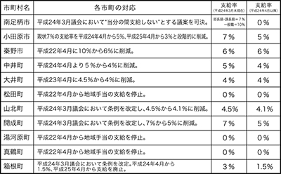 今回可決された改正案は部長級6%、課長級4%、その他の職員3%の給与削減のほかに、当初、地域手当の全額カットが盛り込まれた内容となっていたが、職員組合側との労使間交渉がまとまっていなかったことなどから、市側が議案を取り下げ、地域手当について廃止ではなく「当分の間、支給しない」とした修正案を2月19日に再提出した。今回の条例案可決などによって平成24年度の南足柄市の職員人件費は30億6710万6千円となり、前年比で約13%の削減となる。