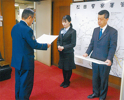 松田警察署(横山雅之署長)で3月30日、振り込め詐欺被害を未然に防いだとして、さがみ信用金庫上大井支店の石川誠支店長と窓口係の加藤美恵さんに感謝状が贈られた。
