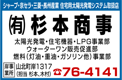 山北町の(有)杉本商事はシャープ、京セラ、三菱、長州産業など各メーカーの住宅用太陽光発電システムの取扱店。同社は足柄上郡を中心に長年プロパンガス業務を行っており、地域密着できめ細やかな対応ができるのが特徴。「取り付け面積などの条件により価格帯が違ってきます。ご連絡をいただきますと、担当者が訪問し説明いたします。見積り無料なのでお気軽にお電話を」と同社。エネルギー環境が問われている今、トータルで検討してみては。