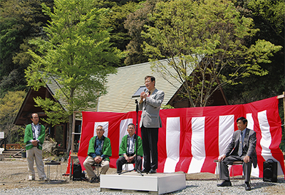 28日、町や議会、地元関係者ら約160人が集まり、再開を祝うイベントが開かれた。挨拶に立った湯川裕司山北町長は「土砂が屋根まで浸かるなど、ここは台風被害の象徴的な場所だった。木も枯れてしまうのではないかと心配したが、再開できたのは皆さんの力添えがあったから。町に大勢の人が来てくれることを期待している」と話した。