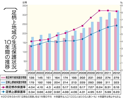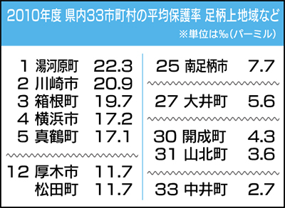 人口1000人当たりの受給者数を示す保護率は県全体で16・64人、南足柄市では10年前(2002年=4・04人)の2・02倍にあたる8・18人、足柄上郡でも10年前(同3・34人)の1・86倍の6・23人となっている。なお上郡の内訳は松田町12・92人、大井町5・24人、開成町5・03人、山北町4・82人、中井町2・43人。足柄上保健福祉事務所では「(受給者は車などを所有できないため)交通の便が良く、病院や商店が集まっている町や、高度経済成長期の都市化等に伴って地縁・血縁のない流入人口が多くなった町ほど受給者が多くなっているのでは」と分析する。