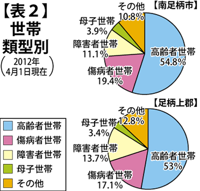 世帯類型別(=表2)では「高齢者」が南足柄市(54・8%)・足柄上郡(53%)共に最も多く、県全体(42・9%)と比較しても比率が高いことが分かる。次いで「傷病者」(同19・4%・同17・1%)、「障害者」(同11・1%・同13・7%)、「母子」(同3・9%・同3・4%)と続き、このいずれにも当てはまらない「その他」も(同10・8%・同12・8%)いる。同事務所では「『高齢者』の割合が多いのは、地域の高齢化に伴うもので社会の縮図のようなもの。一方でリーマンショック以降の厳しい経済情勢などから、『その他』に分類される40代・50代の受給者も増加してきている」と語る。