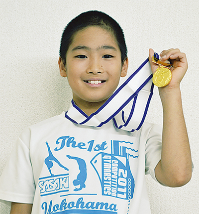 規定で決まった演技をこなすBクラス決勝に出場した、とらい体操クラブ(小田原市田島)所属の露木元太君(開成南小5年)が種目別の跳馬で優勝を果たし た。露木君は開成町在住で6歳から体操を始めた。平日は、ほぼ毎日練習しているという。大会を振り返り「観客が多く最初は緊張した。コーチから着地を決め れば優勝できると言われていたので、とても嬉しい」と喜びの表情で話した。