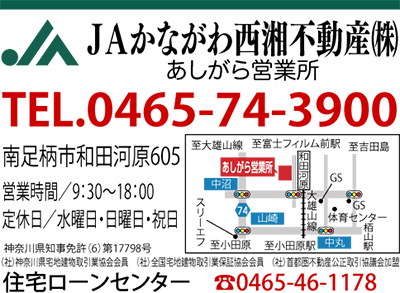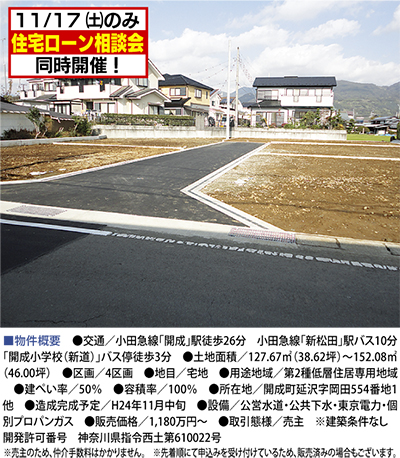 JAかながわ西湘不動産(株)により分譲されている開成町延沢の5区画(1区画は契約済)で11月17日(土)・18日(日)の2日間、現地販売会が開催される。会場では17日にJAかながわ西湘住宅ローンセンターのローン相談会も同時開催される。
