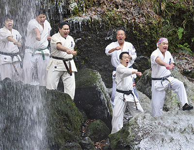 一行は足柄峠で身体を動かしウォーミングアップをした後に夕日の滝へ。滝の周囲には氷柱が張り、気温は3度。凍りつくような寒さのなかで、師範の瀬戸利一さん(57)の指導の下、最初に子供たちが滝の水に足を入れ、しぶきを浴びながら「えいしゃー」と大きな掛け声を上げながら突きを行った。引き続き上級者らが、激しい滝の水を全身に受けながら気迫がこもった突きを続けた。滝壷に胸まで入り突きを行う黒帯上級者の姿もあった。