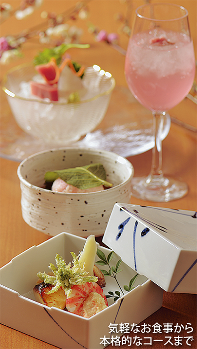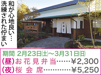 お花見弁当と桜会席。どちらも7品目のたっぷりの献立。会席の煮物には、煮込んだ豚の角煮を道明寺で包み蒸し上げ葛餡で仕上げた「桜の道明寺まんじゅう」を用意。もちもちとした食感と桜の香りで春の訪れを‥。同店限定の桜カクテルもぜひ味わってほしい。その他の御膳あり。店内は古民家風造りで全席テーブル席、個室あり。駐車場完備。祝い事や法事、宴会等にもお勧め。