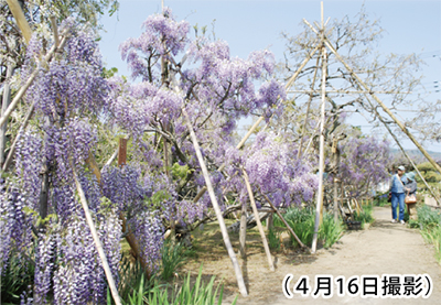ふじ棚を作らずに立ち木造りにこだわった「長井さんの野ふじ」は、横浜や東京などからも多くの人が見物に訪れる同市の花の名所となっている。庭の開放時間は午前10時〜午後4時。
