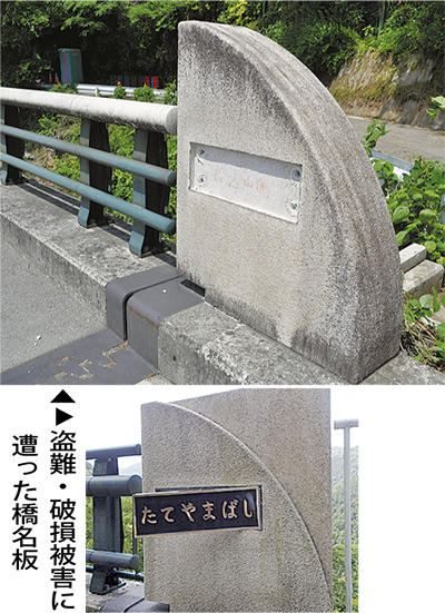 県西土木事務所では、松田町寄地区の県道710号に架かる「立山橋」の橋名板4枚のうち3枚が盗まれ、1枚が破損した状態で発見されたことから5月17日、松田警察署に被害届を出した。同日午前10時頃に現地を通った町職員から通報を受けて発覚した。