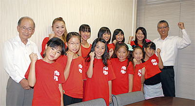 小島代表は「3月頃に大会関係者から出演依頼を受けた」と経緯を語り、出演する10人を「(約40人の)チームメイトの中から選抜した、安心して任せられるメンバー。準備もバッチリ。頑張ってきます」と話した。メンバーも「大きな舞台なのでみんなで協力したい」「一生懸命、笑顔で頑張ります」「めったにないチャンスなので楽しみたい」と意気込みを語った。府川町長は「地域に夢と希望が広がる話。2020年の東京五輪にもぜひ出演を目指してもらいたい。開会式では皆さんの力で周りの人たちを笑顔にしてあげてください」とエールを送った。