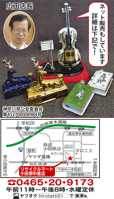 「本やバイオリン、動物の形をしたものなど、最近では凝った容器のミニチュアボトルが人気。買取りも強化中です」と広田店長。