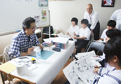 南足柄市出身の漫画家・真船一雄さんが10月17日、母校の岡本中学校で漫画についてのミニ講座を行った。