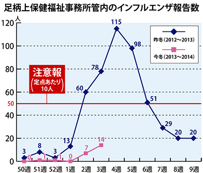 例年1月から2月にかけて流行するインフルエンザが、足柄上保健福祉事務所管内(1市5町)でも「流行開始」レベルになり、じわじわと報告数を増やしつつある。