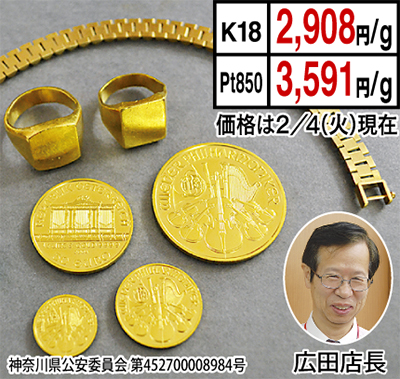 「相場を見ると、プラチナ850・18金ともに、少々落ちぎみながらも、まだ高水準です。写真のような金貨や喜平ネックレスのほか、地金・工業用も大歓迎です!」と広田店長。