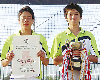 高校総体(インターハイ)ソフトテニスの県予選会が10日と11日に小田原テニスガーデンで行われ、山北高校男子ソフトテニス部の平島拓馬(3年)・遠藤克己(3年)ペアが優勝した。同校ペアの県予選での優勝は初で、インターハイ出場は2年ぶり。